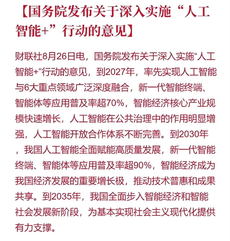 日前,國務院印發《關于深入實施“人工智能+”行動的意見》,提出“三步走”發展目標,2027年AI應用普及率超70%,2030年超90%,智能經濟成為經濟發展重要增長極,2035年全面步入智能經濟和智能社會發展新階段。