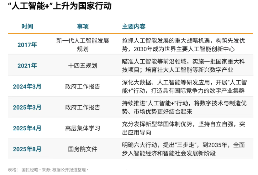 中國連續兩年將“人工智能+”行動寫入政府工作報告,出臺國家級頂層設計文件,將此作為“贏得全球科技競爭主動權的重要抓手”。