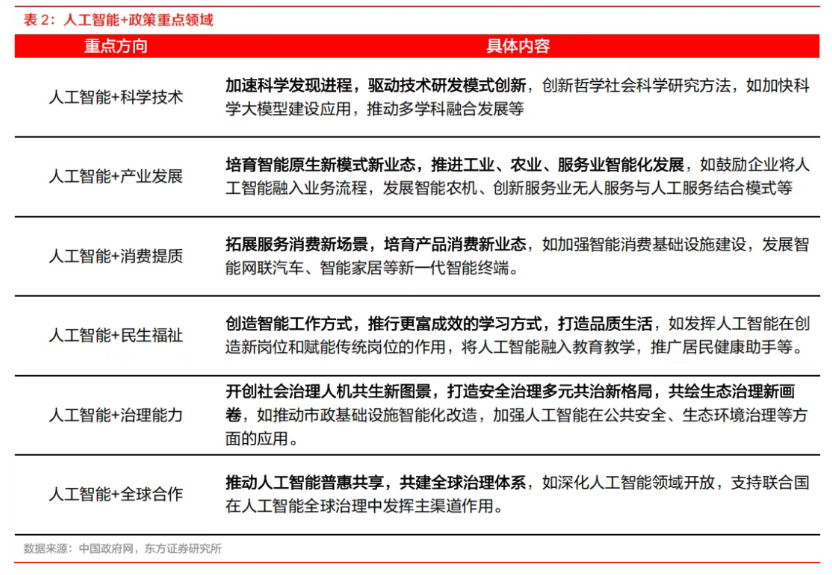根據文件,“人工智能+”聚焦于六大行動,即AI+科學技術、+產業發展、+消費提質、+民生福祉、+治理能力、+全球合作,擘畫出大規模應用的路線圖。